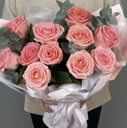 Буукет 11 розовых роз с эвкалиптом | Купить с доставкой в Павлодаре